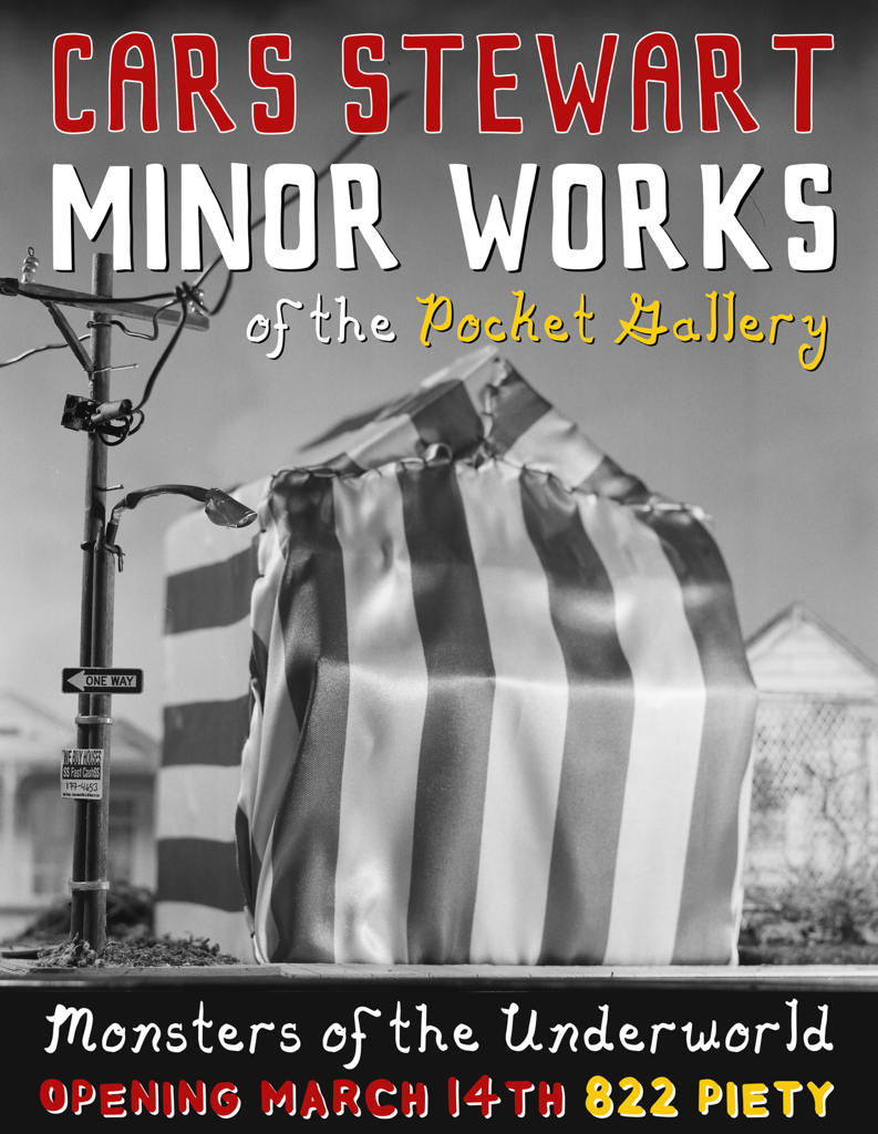 Cars is a New Orleans–based artist and miniature maker working with photography and moving images shot in a carefully constructed small-scale world. Their practice centers on building detailed scenes by hand, often drawn from moments where the natural and built worlds meet, producing images that feel familiar but not entirely trustworthy, like a memory. This body of work uses two scales: within a small gallery sits an even smaller one, inviting viewers to look more closely and notice how shifts in scale can recast a scene, changing what stands out, what fades, and who holds power within it.